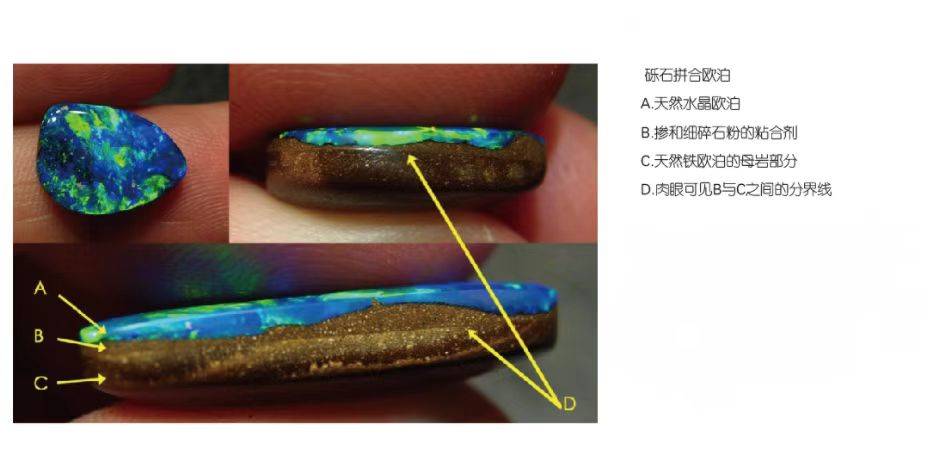 未进行镶嵌的拼合欧泊裸石,识别难度相对较低,从宝石侧面,能够清晰观察到两层或三层质地、颜色截然不同的材料分层,拼接缝隙十分明显。而对于已经完成镶嵌的欧泊饰品,由于侧面的拼接缝隙被金属戒托、镶爪等遮挡,鉴别难度会有所提升。相对而言,镶嵌后的三层拼合欧泊更容易分辨,因为其表层的透明圆顶并非欧泊材质,且本身不具备任何变彩与色彩,只需格外留意那些工艺精湛的三层石,这类作品的顶部圆顶打磨得极薄,需要更加细致地观察才能发现端倪。