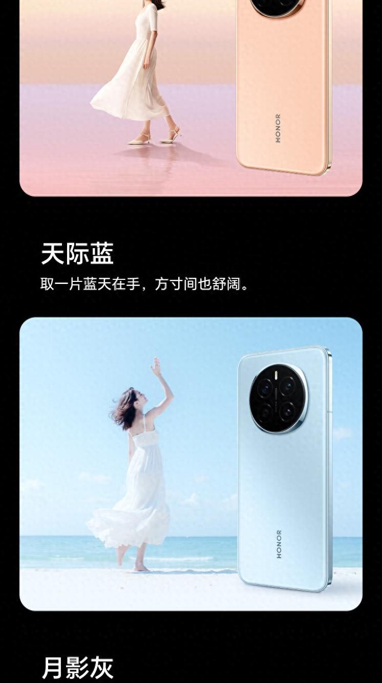 荣耀Magic7还提供了五款配色,“绒黑色”“雪域白”“天际蓝”“朝霞金”以及“月影灰”各有特色。