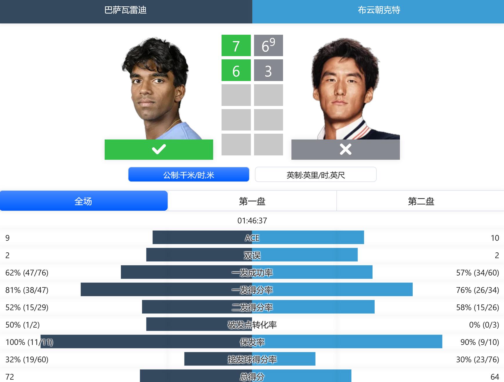 随后出战的布云朝克特就没有这么幸运了,面对美国新星巴萨瓦雷迪,小布在首盘抢七错失盘点之后,次盘3-6再丢一局,大比分0-2负于对手,首战出局。