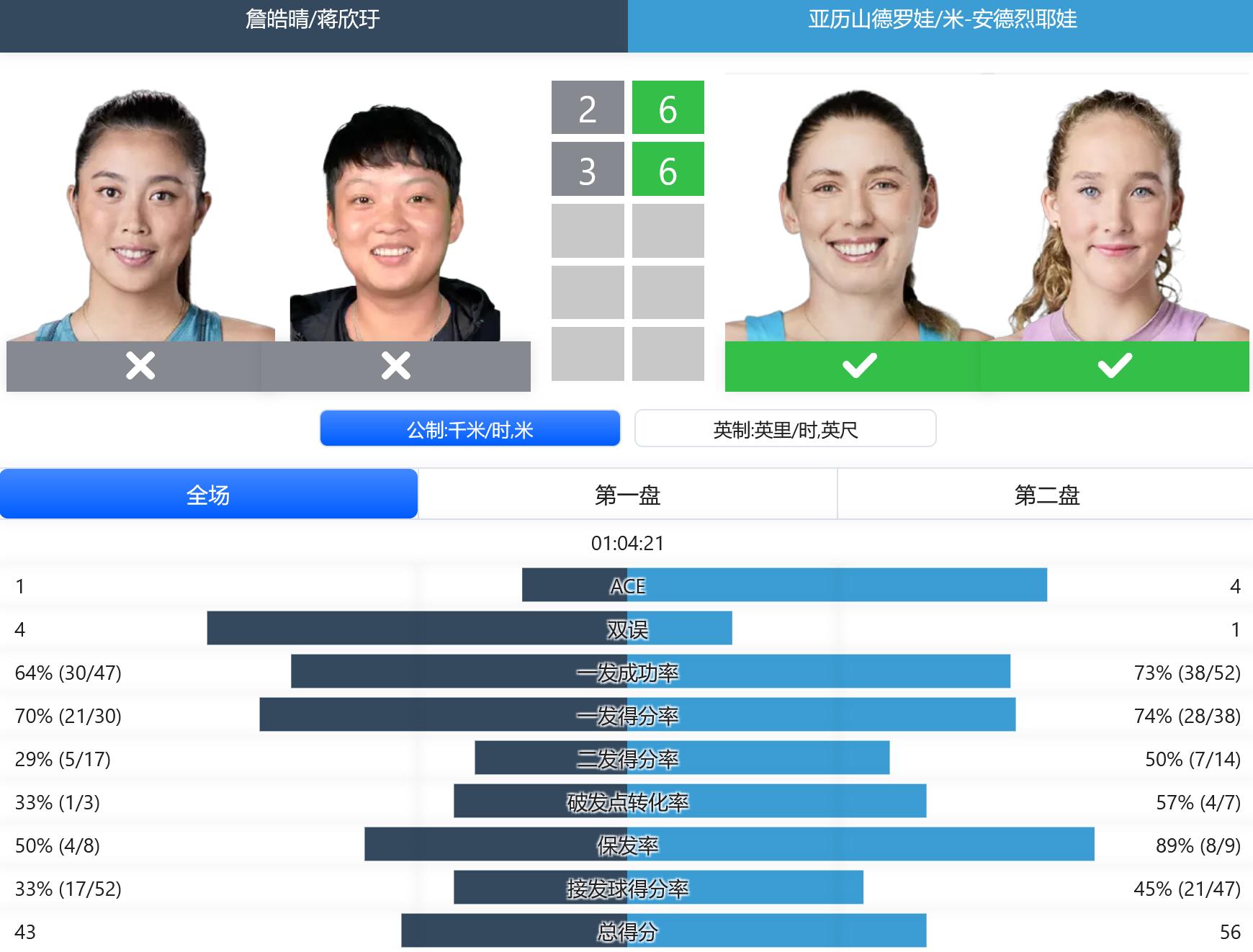 老将张帅搭档萨姆索诺娃遭遇单打高手组合萨巴伦卡/巴多萨,最终两盘抢七告负,十分遗憾。