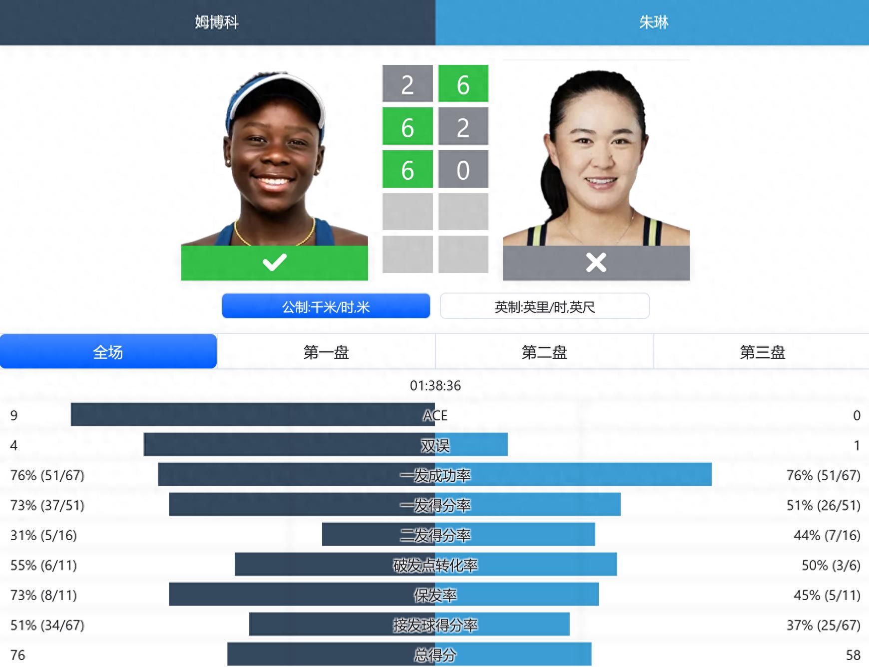女单方面,朱琳以6-2拿下首盘,让球迷看到中国金花赛季初的竞技状态十分不错。无奈对面是去年的WTA最佳新人,即使经历了首盘的失败,也能及时调整,最终加拿大新星姆博科连扳两盘,率先拿下第一分。