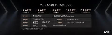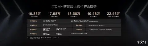 其中,汉DM-i智驾版共推出5款车型,售价16.88万~22.58万元;汉EV智驾版共推出5款车型,售价17.98万~23.58万元,开创B+C级轿车全民智驾,加配不加价!
