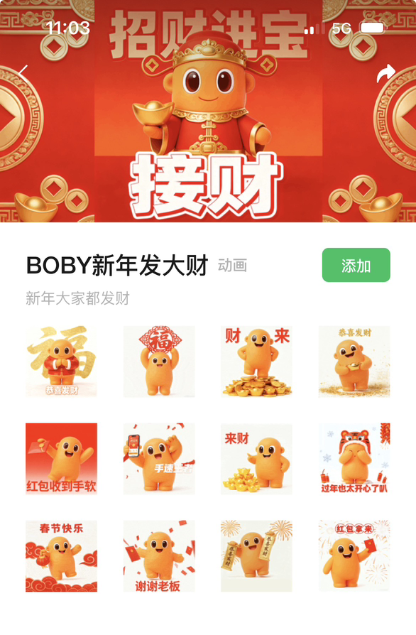 🚀如何get?打开表情商店,搜索“BOBY新年发大财”或“新春好运马上到”,点击添加,让BOBY成为你聊天框里的“气氛组担当”!