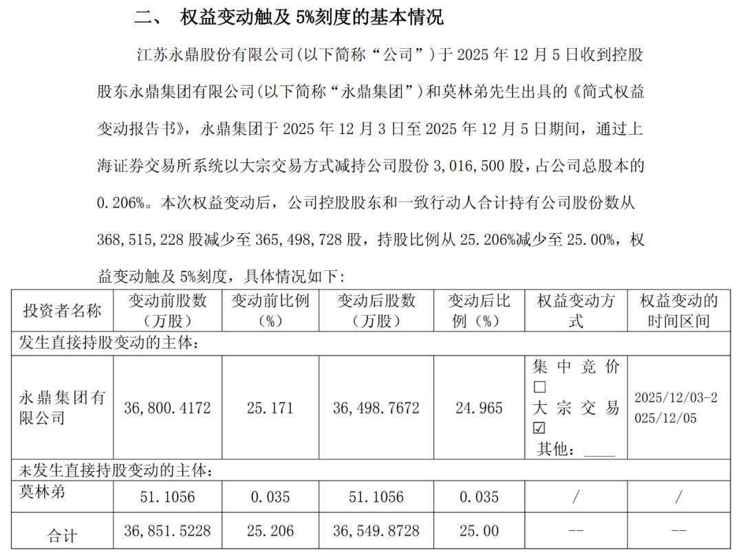 12月3日-12月5日,永鼎集团及其一致行动人减持永鼎股份301.65万股,占公司总股本的0.206%,减持方式是大宗交易,折价率为13.64%。