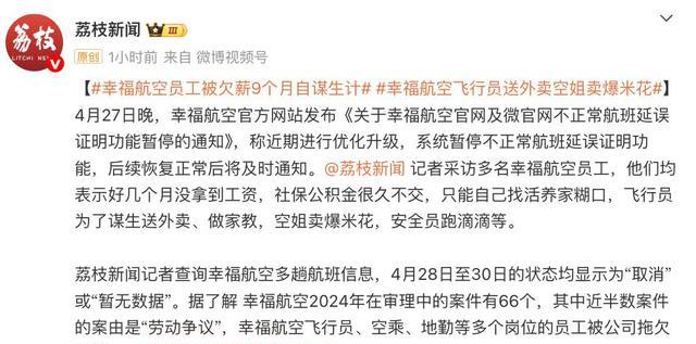 九派新闻2025-04-28《幸福航空取消五一前所有航班,内部人士回应,此前被曝陷入员工欠薪风波》