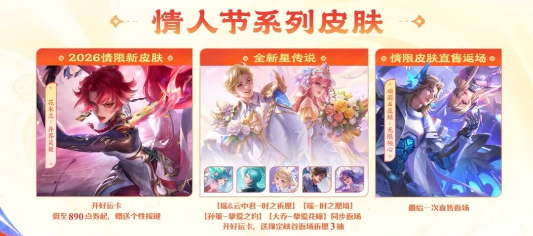 这可能是为了弥补花木兰情限只要一款皮肤的短板。所以,除了花木兰单人情限,乔策星传说之外,还有好几款情侣皮肤返场,包括瑶云中君时之祈愿、瑶时之愿境、孙策挚爱之约、大乔挚爱花嫁、项羽虞姬无限倾心。