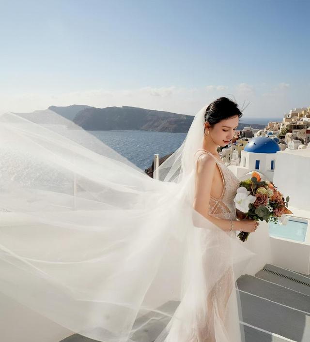她身着白色婚纱,笑容灿烂,幸福溢于言表。