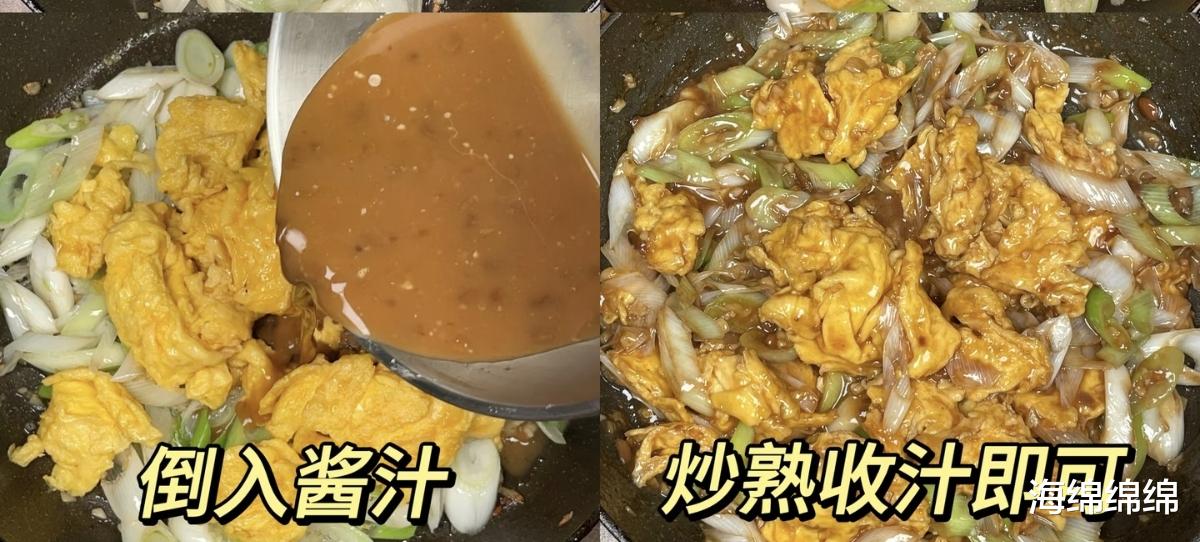 此时,将调好的酱汁再次搅拌均匀(防止淀粉沉底),沿着锅边淋入。大火快速翻炒,让酱汁迅速收浓,均匀地包裹在鸡蛋和大葱上。你会看到汤汁变得浓稠发亮,紧紧地附着在食材表面,散发出诱人的酱香味。待汤汁收至浓稠,即可关火出锅。