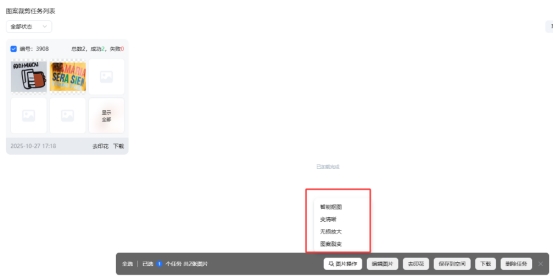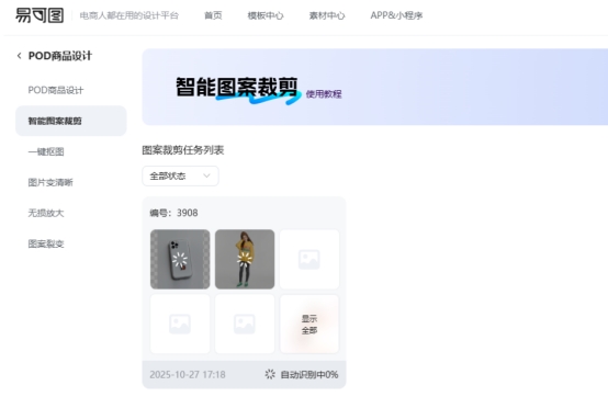 打开易可图,在POD商品设计工具集中找到智能图案裁剪,进入后点击创建图案识别任务,然后上传原图片,一次最多可以上传 100 张图片。