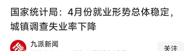 信息来源:九派新闻2025年5月19日发布文章《国家统计局:4月份就业形势总稳定,城镇调查失业率下降》