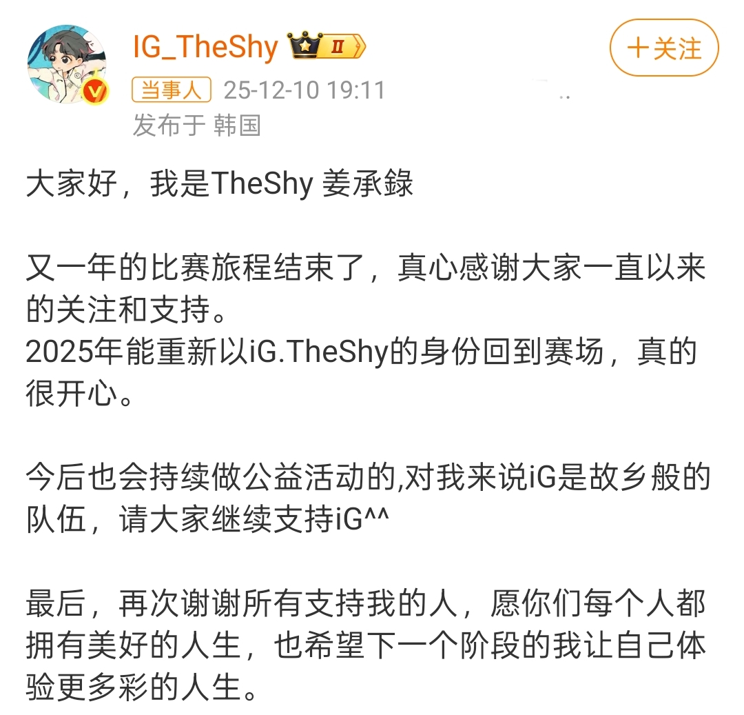朱开爆料TheShy将永久退役值得一提的是,在IG俱乐部官宣TheShy离队休赛的消息后,TheShy随即便在个人社交账号发文告别赛场,坦言在S15赛季,能够以IG上单选手的身份重新回到赛场,感到十分开心,希望下一个阶段的自己可以体验更多精彩的人生。对此,LPL大满贯教练朱开认为,TheShy大概率要永久退役了,TheShy已经明确表示,未来将开启下一阶段的精彩人生,其实就是准备告别职业赛场了,尽管LPL观众粉丝们都希望TheShy未来能够再次复出,但可能性微乎其微。