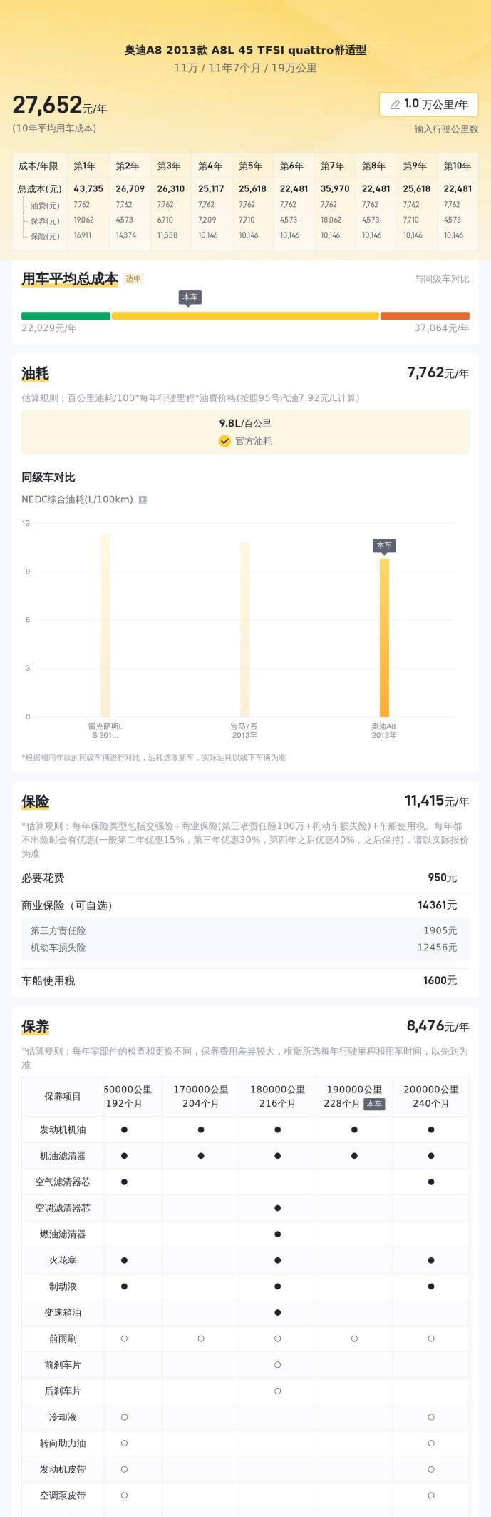 除了维修保养成本之外,油耗也是一个需要考虑的因素。3.0T的排量,意味着它的油耗不会太低。根据估算,这辆A8L的百公里油耗大概在12L左右。按照目前的油价计算,每年的油费也是一笔不小的开支。