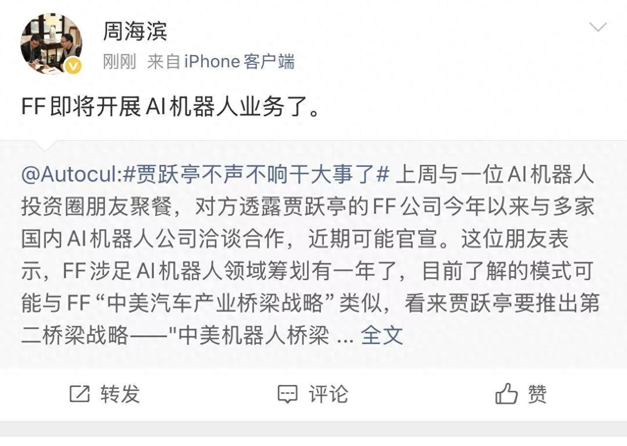 据周海滨透露,他从一位国内专注于AI机器人领域的投资人处获悉,贾跃亭创办的FF公司今年以来已与多家国内顶尖的AI机器人公司进行了多轮深入接触与合作洽谈,近期可能就会官宣。据周海滨微博表示,FF涉足AI机器人领域筹划有一年了,目前了解的模式可能与FF“中美汽车产业桥梁战略”类似。难道继汽车之后,贾跃亭正试图复制其“桥梁”模式,构建一个新的“中美机器人桥梁”?