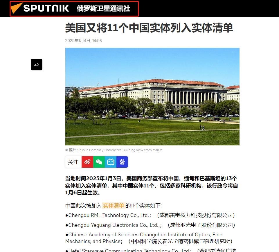 来源:俄罗斯卫星通讯社 2025年1月4日 报道“美国再度将11个中国实体纳入实体清单”