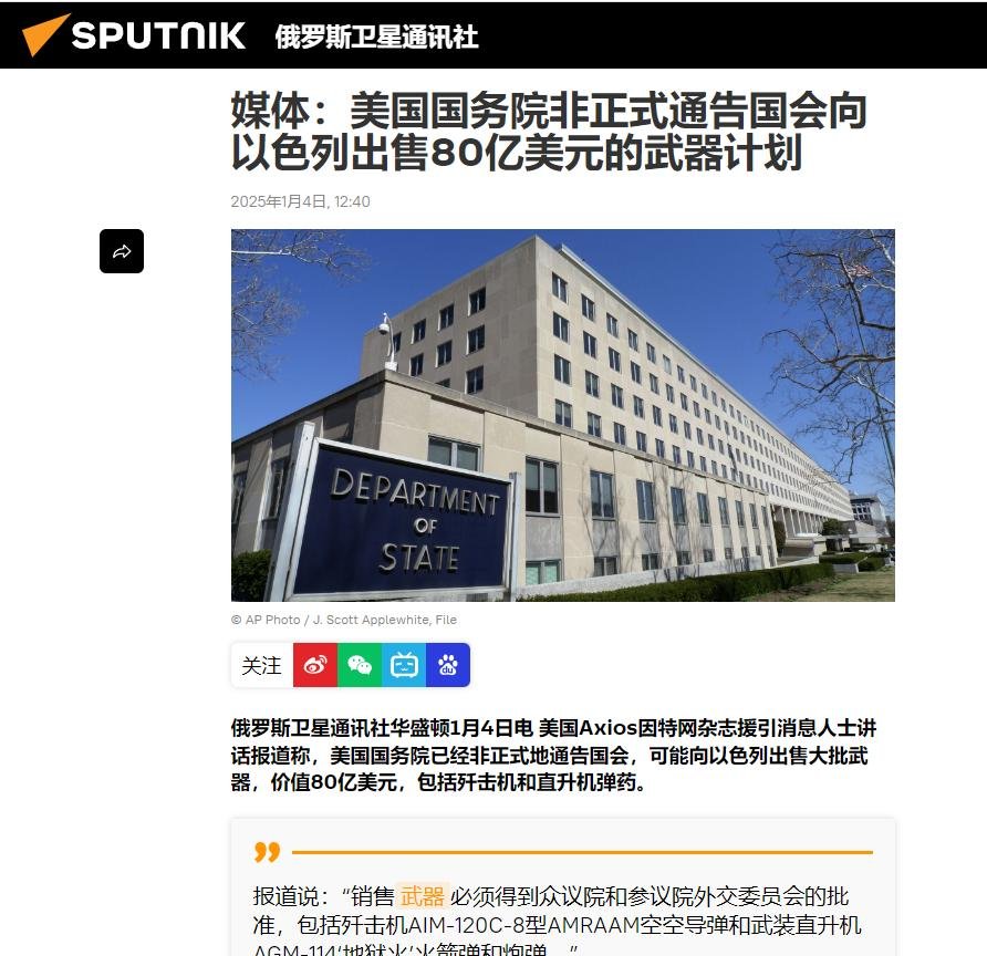 来源:俄罗斯卫星通讯社 2025年1月4日 关于“媒体报道称,美国国务院向国会非正式通报计划向以色列出售80亿美元武器”的消息