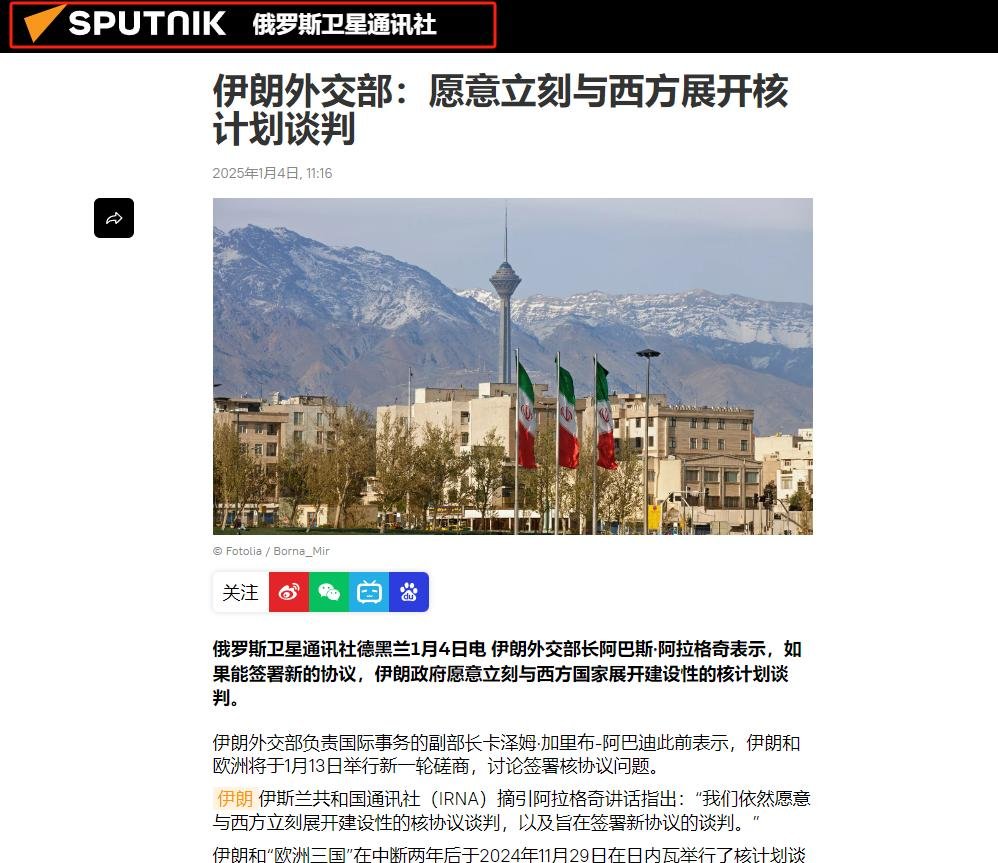信息来源:俄罗斯卫星通讯社 2025年1月4日 报道关于“伊朗外交部表示愿意立即与西方进行核计划谈判”