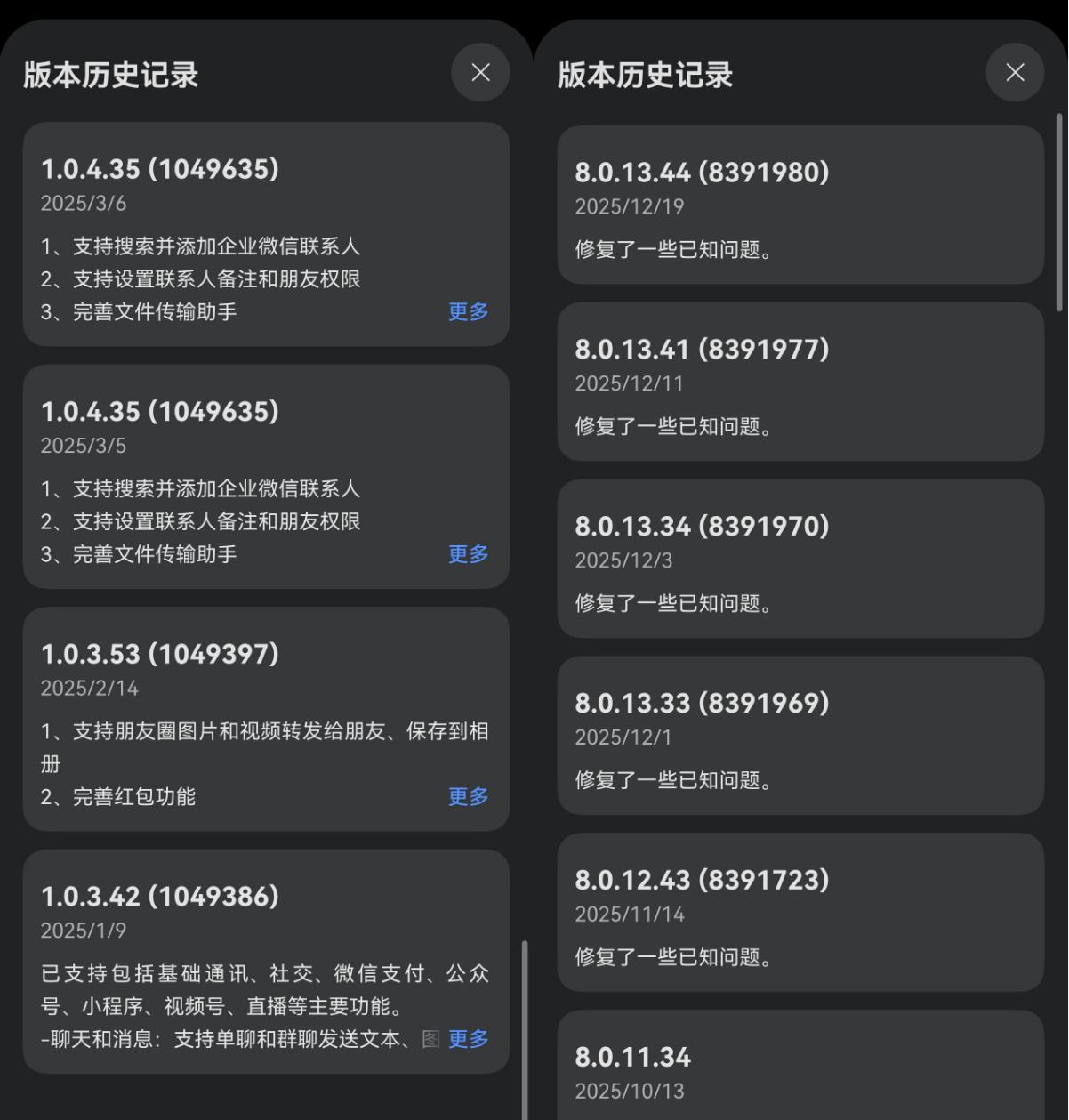 不过,随着时间的推移,鸿蒙版微信已经快速成长起来。从去年10月开始内测,到今年1月正式上架,微信团队按照每月一个大版本、每周一个小版本的节奏持续更新。到今年10月13日,已经发布了12个大版本和109个小版本,平均每两个工作日就有一个新版本提交。这样的迭代速度,让鸿蒙版微信的功能迅速完善。