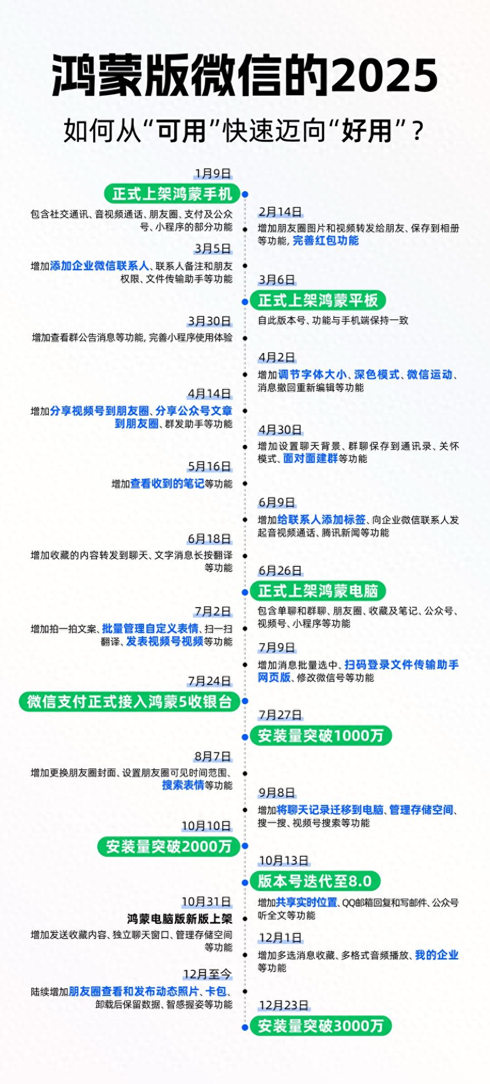 进入下半年,鸿蒙版微信的迭代速度进一步加快,功能体验持续深化。从更换朋友圈封面、聊天迁移到电脑,到搜一搜、共享实时位置等实用功能陆续上线,鸿蒙版微信不断贴近用户真实使用场景。10月,安装量突破2000万,版本号也正式升级至8.0。到12月下旬,安装量已突破3000万,动态照片、卡包、智感握姿等特色功能相继亮相,为用户带来更流畅、更便捷的日常体验。