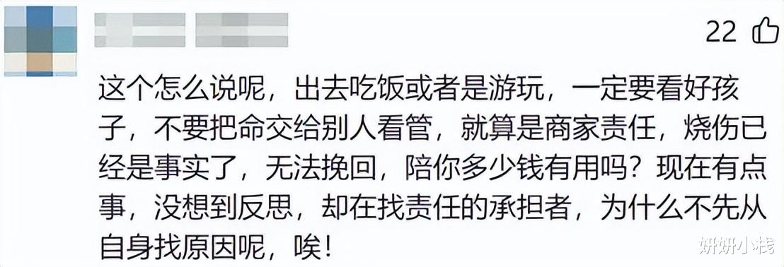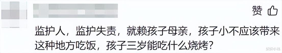 这位网友称,监护人没尽到责任,有些人就光赖男孩妈妈,说男孩小就不该带去这种地方吃饭,可男孩才三岁,能吃啥烧烤啊?