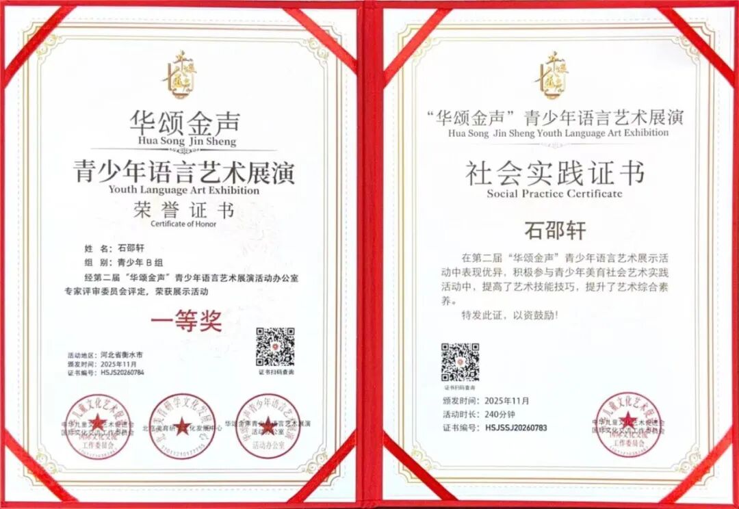 近日,在覆盖全国23个省的“华颂金声”国家级语言艺术展演中,安平志臻学子再传捷报,该校高中部石邵轩、王禹涵、李盛然三位同学,凭借扎实的语言功底与出色的舞台表现,从23个省份的千余名选手中脱颖而出,一举斩获三项全国一等奖,成功入围全国总决赛。