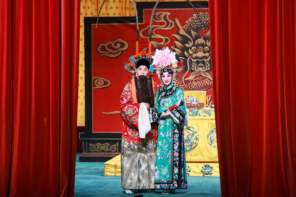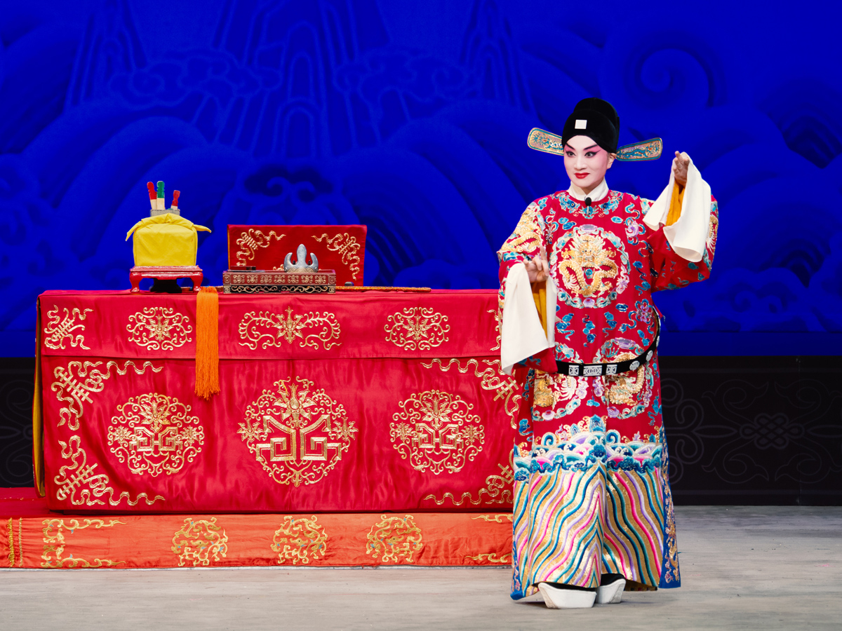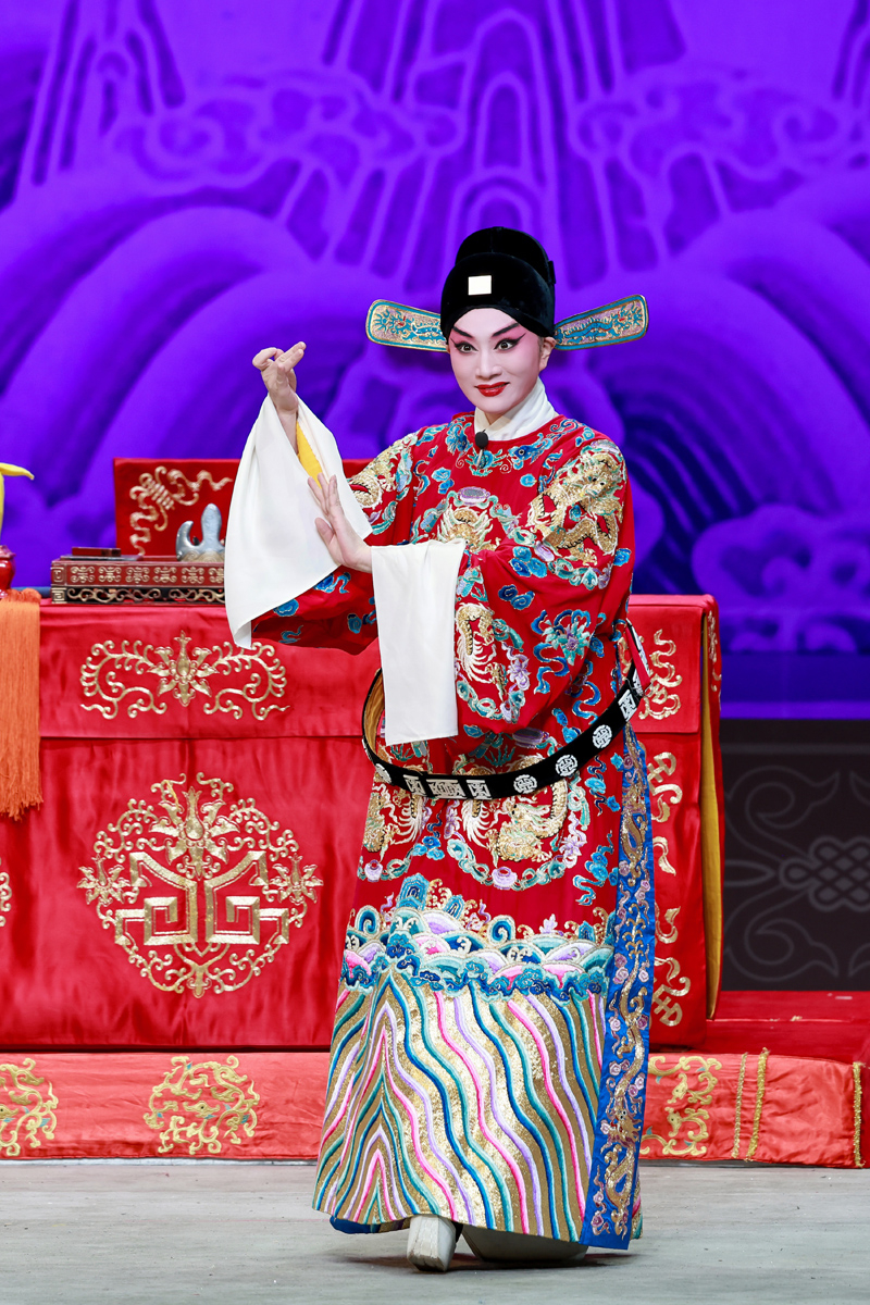路洁为习得该剧精髓,自2020年起,每周专程赴天津向京剧名家王艳学习了三年。王艳老师对气口、劲头、身段等细节的严苛要求,让路洁精准把握了谢瑶环的人物特质。作为生旦两挑的剧目,路洁在剧中既需展现旦行的端庄柔美,又要诠释小生的轩昂英气。演出开场,闷帘一声“来了”便收获碰头彩,身着巡按红蟒官服的亮相英气勃发,完美诠释了正义化身的形象。“头公堂”一折中,堂审武宏的大段念白刚劲有力、张弛有度,将谢瑶环不畏权奸的凛然正气展现得淋漓尽致;“花园”一场则尽显女儿家的娇羞柔情,“谢瑶环深宫九年整” 的南梆子唱腔婉转旖旎,配合遮面团扇的细腻身段与小圆场走位,将与袁行健的情意绵绵刻画得美不胜收,与小生演员刘明哲的默契配合赢得满堂喝彩。
