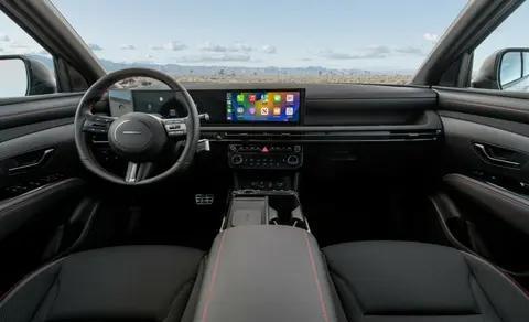 该车方向盘采用真皮材质,具备上下及前后调节功能,还能实现多功能控制、换挡以及加热。中控配置了由12.3英寸液晶仪表与12.3英寸中控屏构成的联体式大屏,内部装有Bluelink车载智能系统,可支持导航路况展示、CarPlay互联映射、车联网、OTA升级、双区域语音唤醒等。其空调控制区在中控屏幕下方,为触控式设计,再加上贯穿式空调出风口与换挡机构,操作便捷。