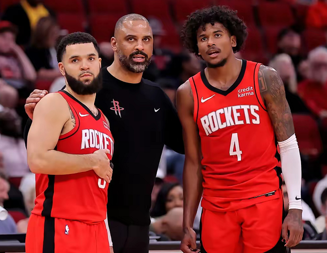 火箭队3-4轰然出局,球队年轻人们的表现、评价和境遇却有着天壤之别!申京作为火箭队内唯一一位全明星球员,他在这轮系列赛中场均出战36.6分钟,场均贡献20.9分+11.9篮板+5.3助攻+1.9抢断,命中率为45%,罚球命中率为62.5%。据统计,申京是NBA历史上第二位在生涯首个系列赛场均至少砍下20分+10篮板+5助攻的球员,比肩约基奇!申京确实有着约基奇一样的全能身手,但不可否认的是,跟约基奇相比,申京的射程、罚球都有点惨不忍睹!赛后,申京坦言:我在进攻端有些挣扎,这将是我休赛期努力训练的方向,我会在下赛季表现更好。