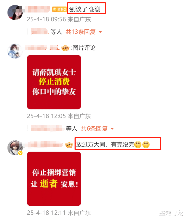 然而,这场情感袒露因时间节点的巧合引发争议——4月19日,她将在广州开启“Let Me Love You”巡回演唱会首站。所以网友质疑:“刚说完悲伤,转头就开演唱会,是否将朋友离世作为营销工具?”回顾从3月1日方大同去世至今,薛凯琪的“悲伤表演”已上演三次:音乐节落泪、演唱会失控、专访哭诉,且每次均精准卡在公众视野焦点时刻,也不知是否巧合,以至于这次话题上了热搜,大量网友都在评论区让薛凯琪别再消费方大同了,甚至还用图片强调“请薛女士停止悲伤表演”。