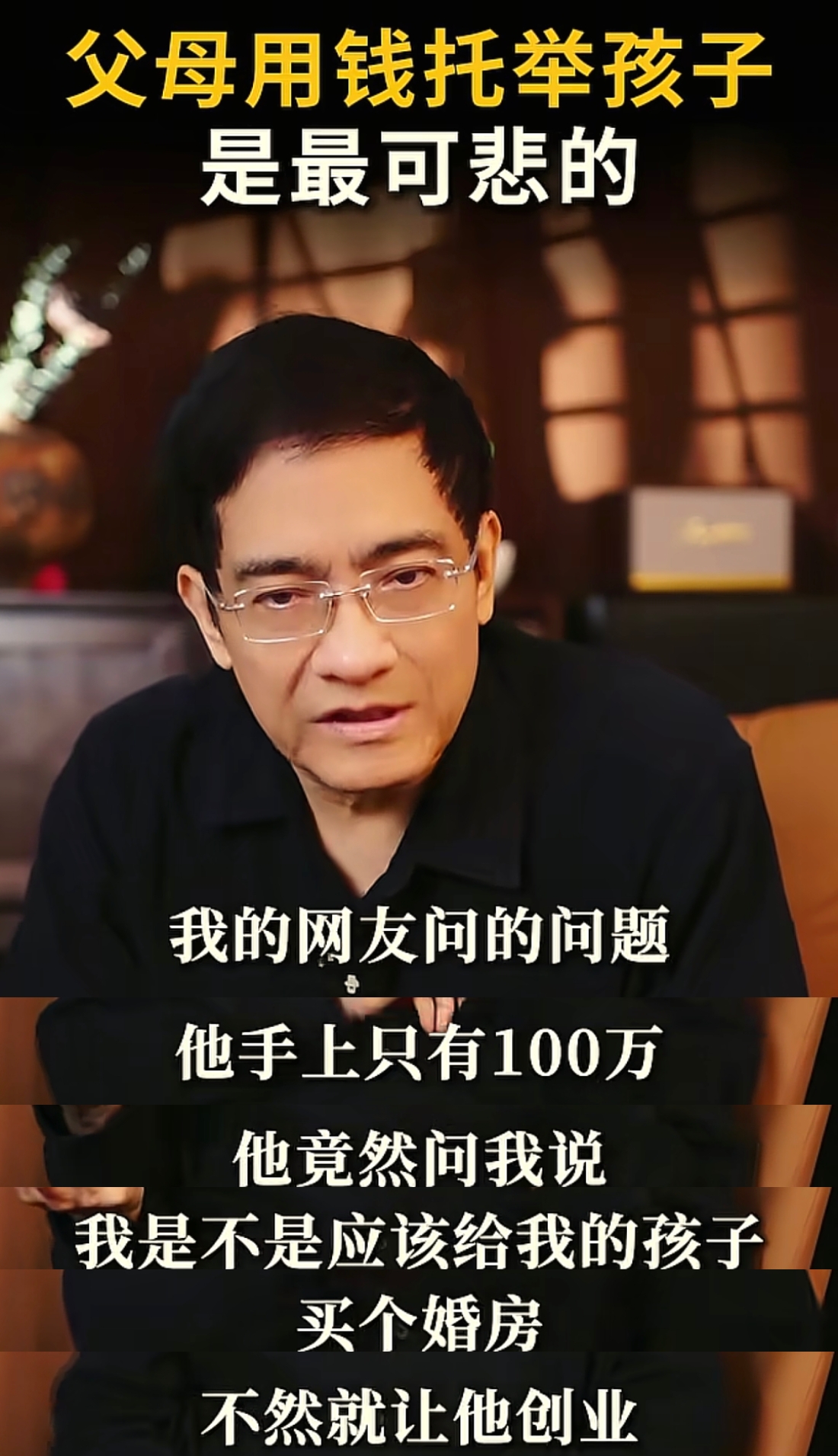 著名的经济学家郎咸平就接到一个粉丝的提问,这个粉丝就说:我现在有100万,我是给自己的孩子买婚房呢,还是给自己的儿子创业?