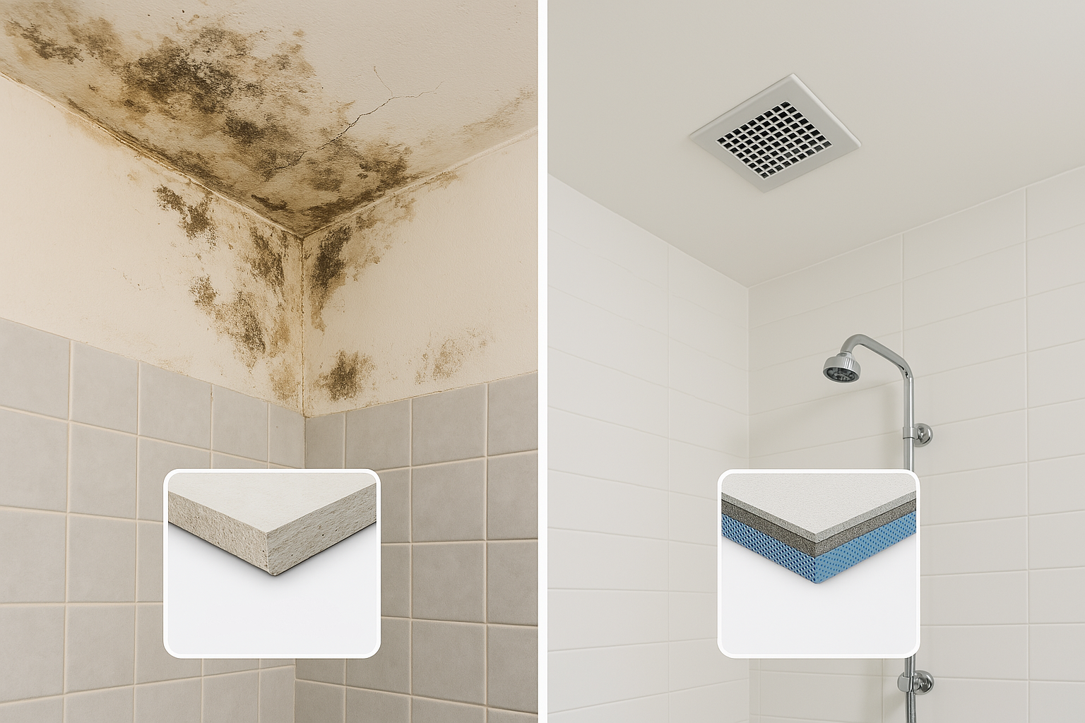 防水内衬板就是为这种环境设计的。它的内芯不吸水,外层结构密实,加上配套使用防水带和密封胶,连接处也能做到比较完整的闭合。这种结构不容易被水汽渗透,不吃潮也不发霉,稳定性比石膏板好太多。