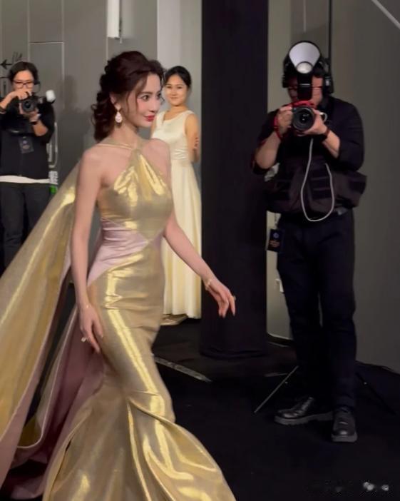 杨颖这次选的这条金色挂脖礼服,乍一看确实闪得晃眼。