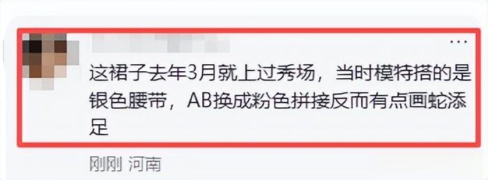 “这裙子去年3月就上过秀场,当时模特搭的是银色腰带,AB换成粉色拼接反而有点画蛇添足。”
