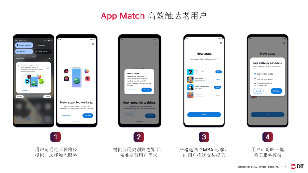 除了新机预装,我们还有存量市场设备上的预装App Match,通过加入一定的智能推荐算法来根据用户行为和偏好,定期推荐一些应用进行下载,更贴近用户使用场景。整体体验路径是:运营商询问用户授权,用户点击同意后定期向手机推送应用进行下载。
