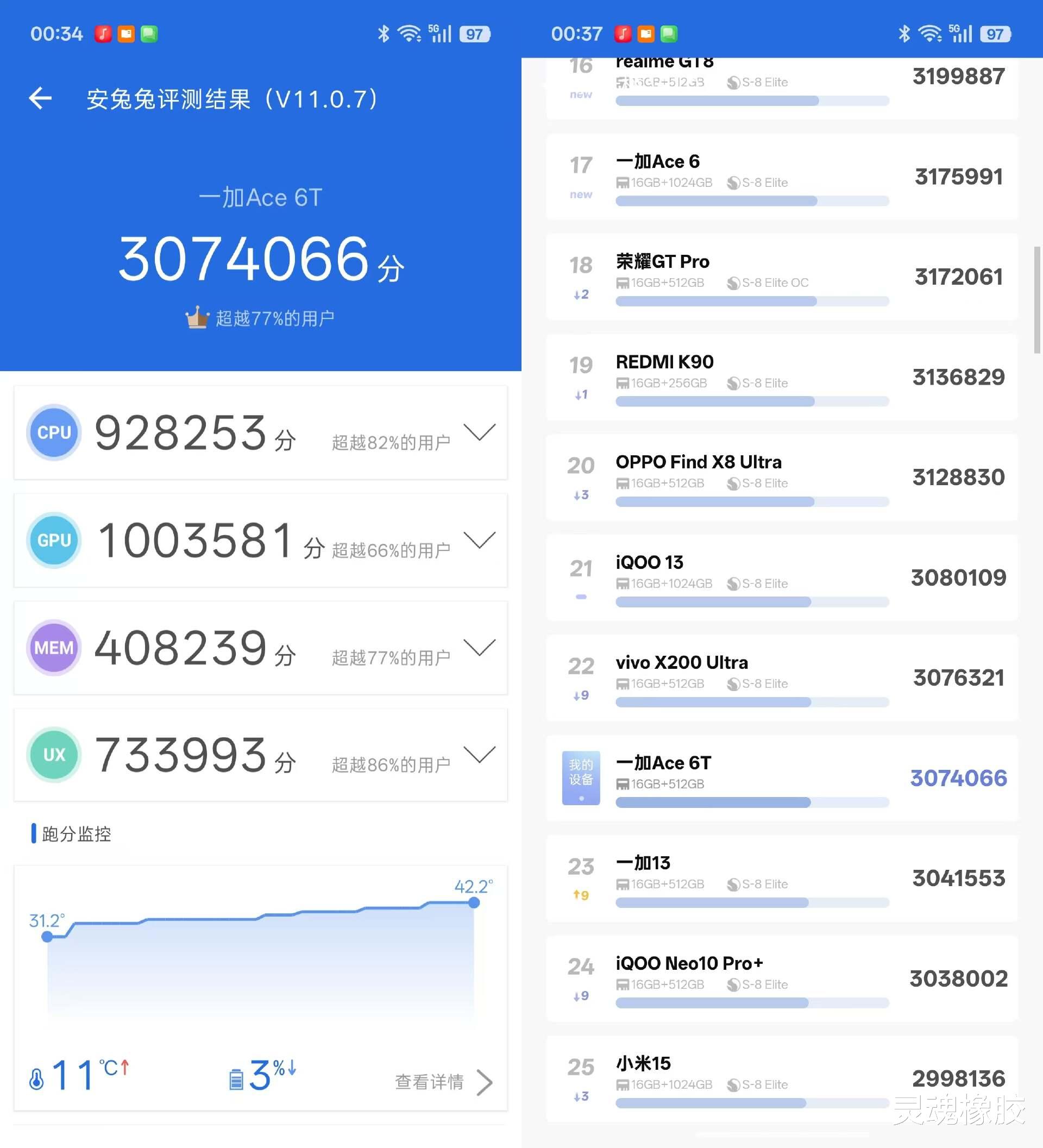 说起性能,就绕不过跑分了,目前北方供暖状态,室内23.5℃,满电状态的一加Ace6T 电光紫 16G+512G版本实测跑分为3074066分,跑分期间温升11℃,耗电仅3%,这个分数是在我的预料内的,毕竟这款手机不论是处理器还是内存组合都是旗舰级的。