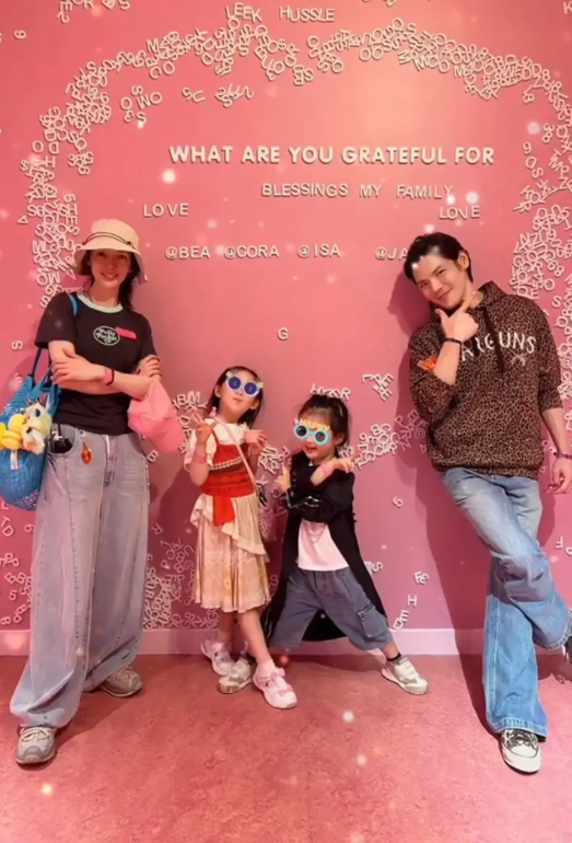 先上一波名场面暴击!Vlog和合照里的一家四口,没有豪门的矫揉造作,只有藏不住的烟火气和幸福感。镜头里,向佐身穿休闲豹纹上衣,褪去了舞台上的凌厉,眉眼间满是柔和,怀里抱着3岁的儿子向笙,一手还扯着5岁女儿向芷的马尾,嘴角咧得快到耳朵根,奶爸范十足。郭碧婷则是全程素颜出镜,用鲨鱼夹随意扎起长发,简单的黑色T恤配牛仔裤,没有浓妆艳抹,没有珠宝加持,却依旧气质出众,站在孩子们身边,眼神温柔得能滴出水来,完全看不出已是两个孩子的妈妈。