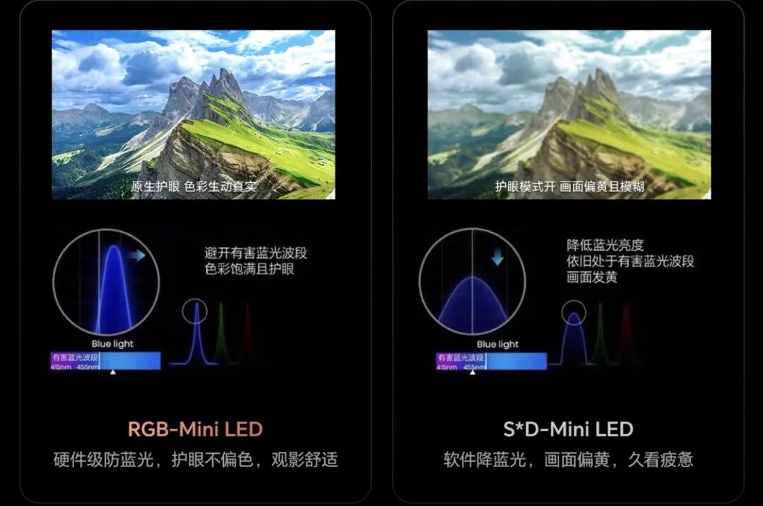 再者,在视觉健康与舒适方面,RGB-Mini LED/Micro LED无需依赖高能蓝光去激发其他颜色,可以从光源物理层面优化光谱,直接将量子点Mini LED有害的短波蓝光的比例大幅降低。这意味着在获得鲜艳画质的同时,实现了真正的“护眼不偏色”,解决了用户长期观看的疲劳痛点。