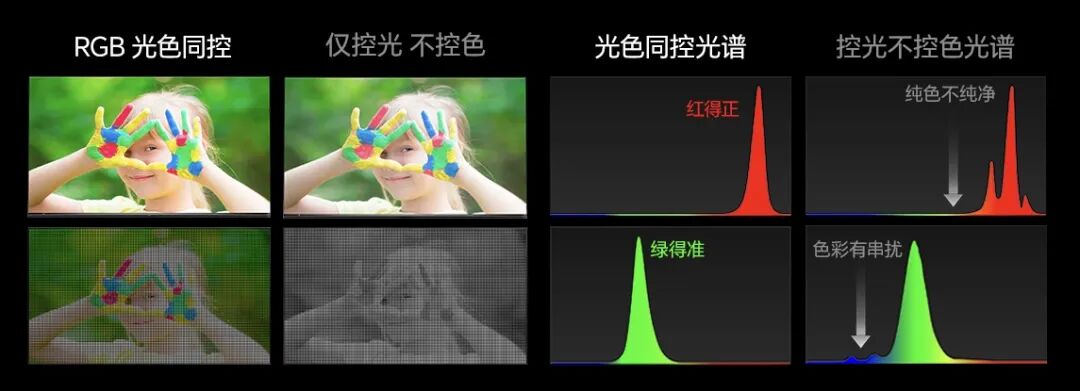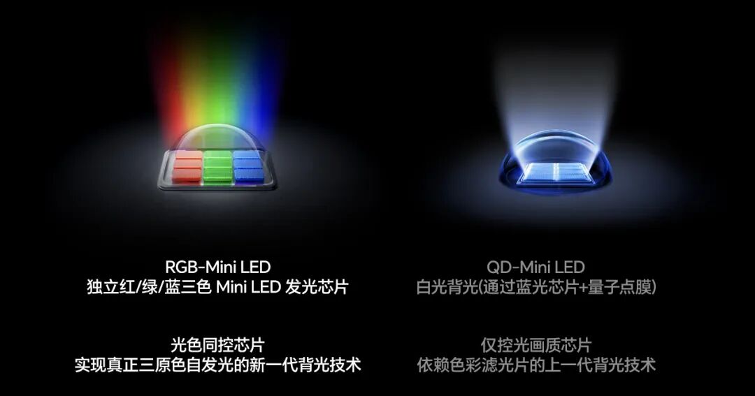 我们先来看以RGB-Mini LED/Micro LED为范本的“原生彩色光”技术,因为光源直接发出纯净的三原色光,从而具备了代际性优势。