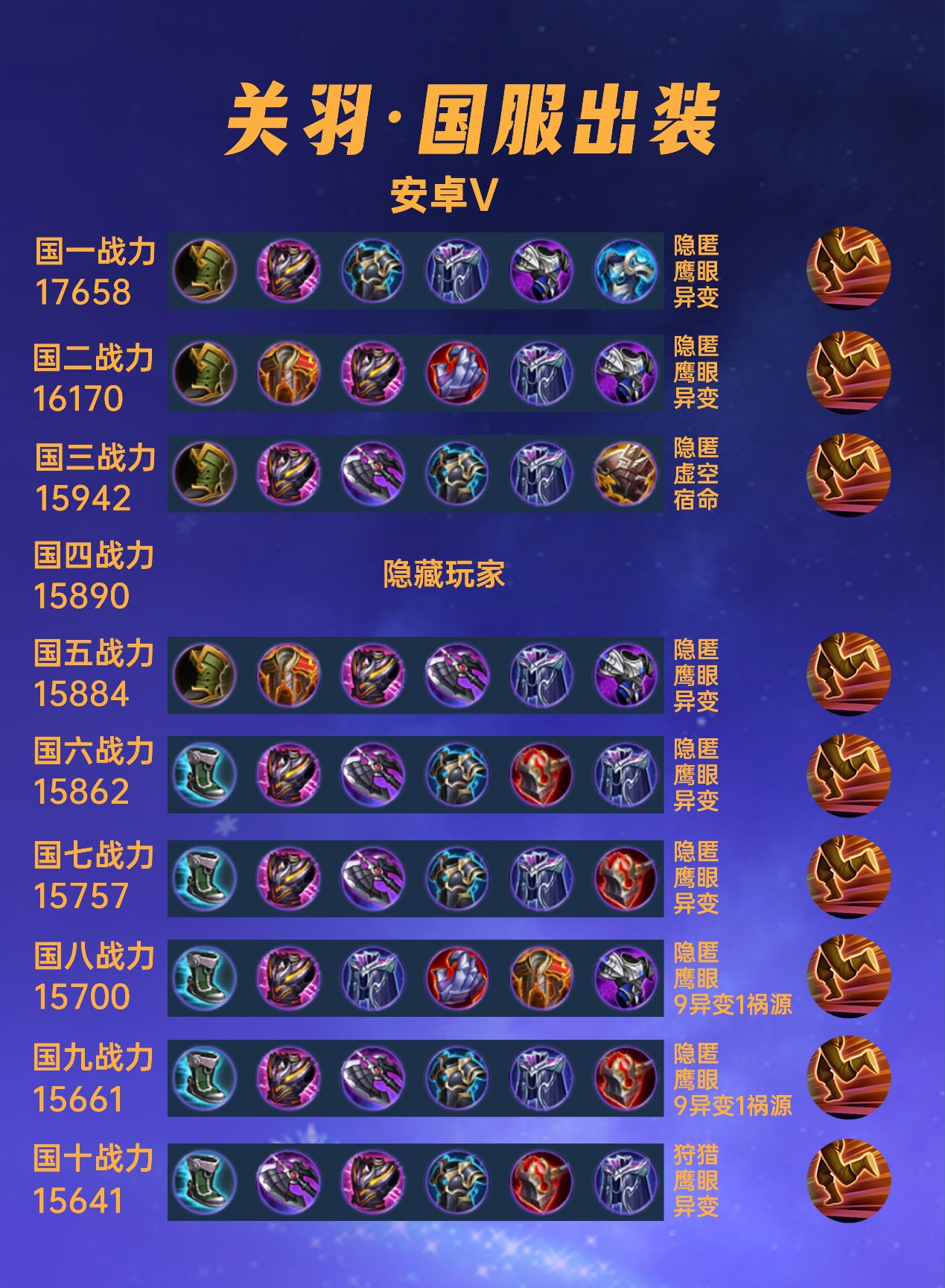这篇文章我们来看一下40位国服关羽的出装铭文汇总。