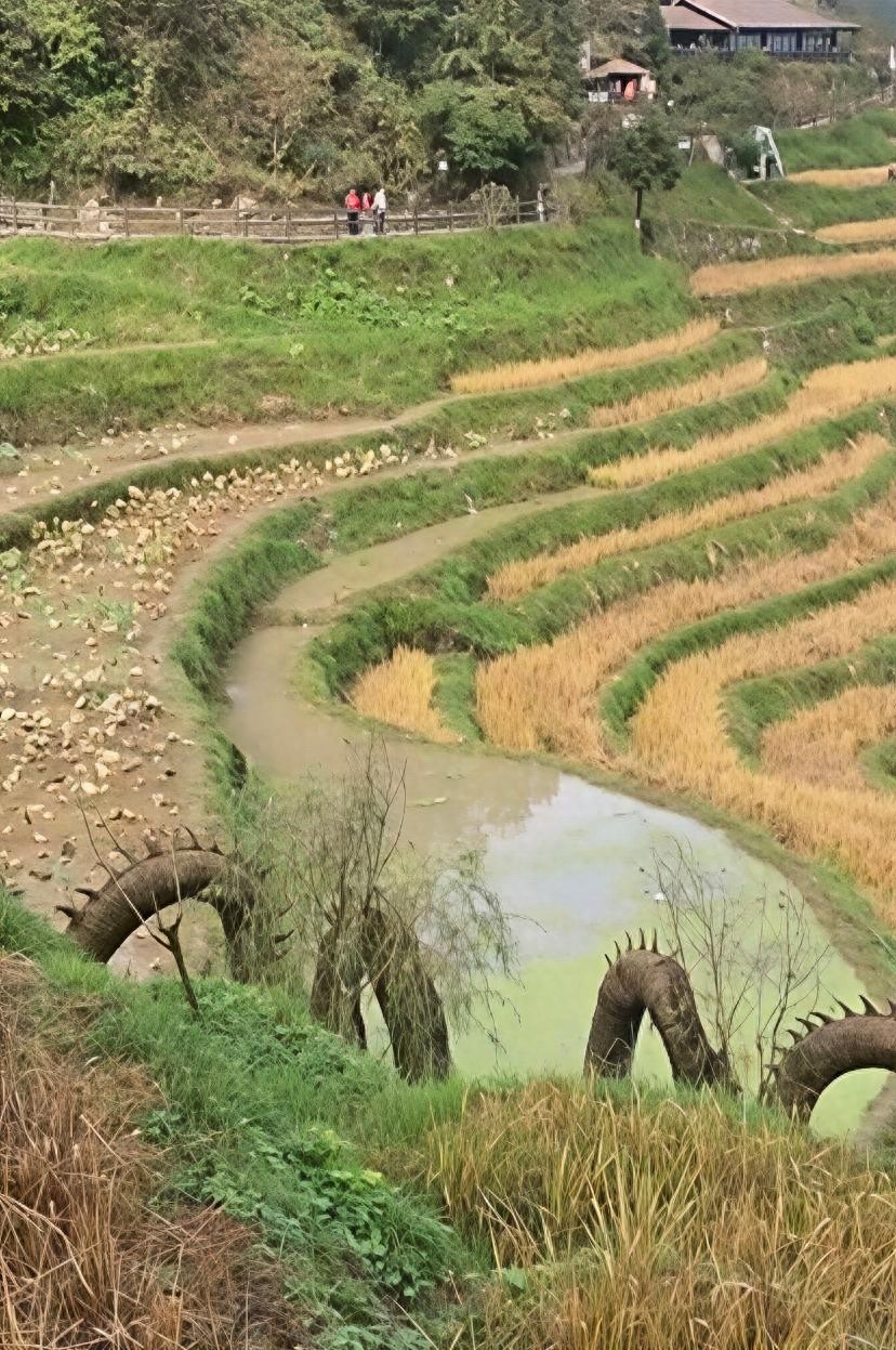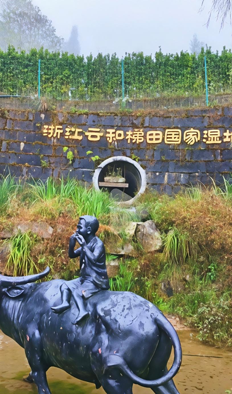 巨大栩栩如生的雕像巨牛,乘坐着一个小牧童,这是在梯田进去的路上,周围特别安静,整体风景如画,感觉这里像是大自然精心制作的的绿色风景一样,层层叠叠梯田,小编也是第一次看见这么大的梯田,千姿百态的形态,令人沉醉其中的感觉。
