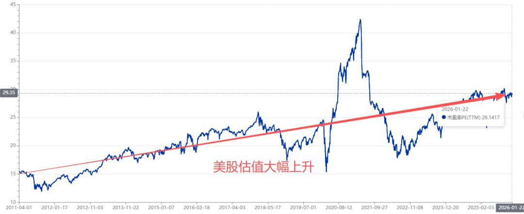 2010年至今,美股PE是从15倍提升到30倍。下图是标普500指数2010年至今的估值走势。