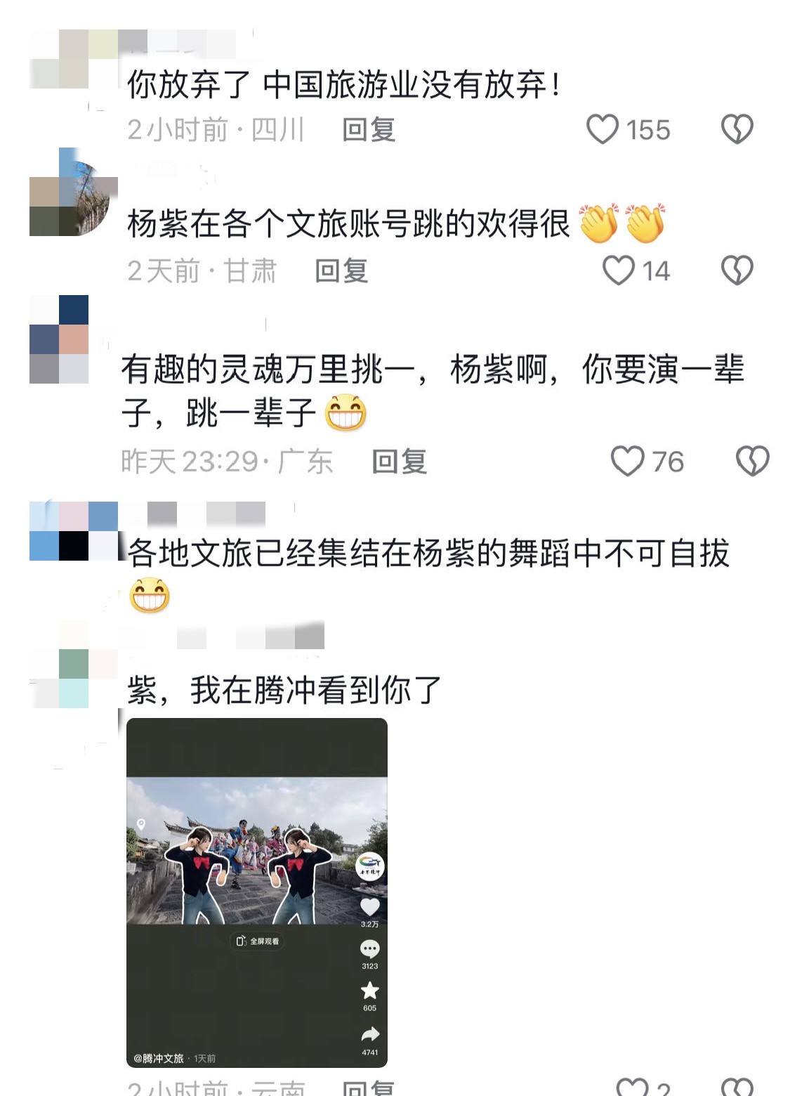 网友们也纷纷参与到这场狂欢中,有人表示跟着杨紫一天游遍全国,微信步数稳居第一;有人夸赞杨紫短短十几秒展现了8个舞种,别人跳舞要钱,杨紫跳舞,帮各地文旅完成KPI;还有人调侃说:“我家文旅已跟上;她跳到哪儿了?