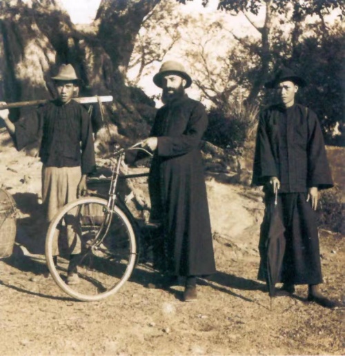 (图2:麦兆良神父常常与助手一起游走在捷胜中,他身穿黑色道袍,满腮的黑胡子,头戴一顶黑帽,样子特别显眼。)