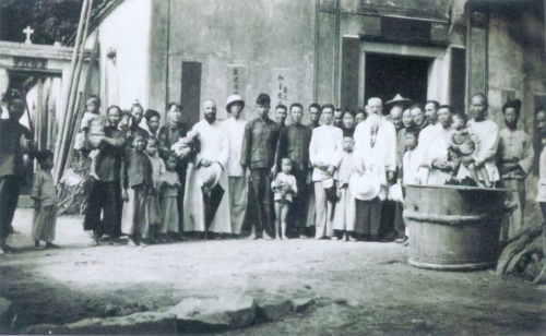 (图1:芬戴礼、麦兆良神父对沙坑遗址的考古调查离不开当地村民的引路和帮助,图为两位神父与村民的合影。)