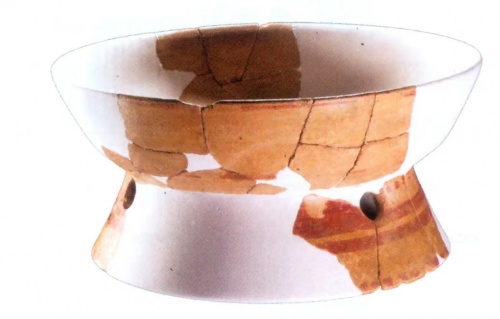(图3:麦兆良在沙坑北发现的有彩绘及刻划波浪纹、镂孔等装饰的圈足陶盘,他认为,有圈足的供奉盘是祭祀之用具。)