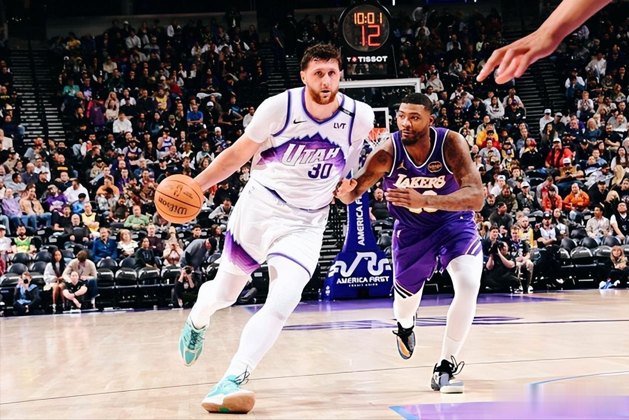 比赛速递首节(湖人32-41爵士):湖人核心东契奇首节独砍10分,凭个人攻击力稳住开局;爵士双核乔治与贝利联手贡献15分压制节奏,两队分差紧咬,首节结束爵士领先 9 分。
