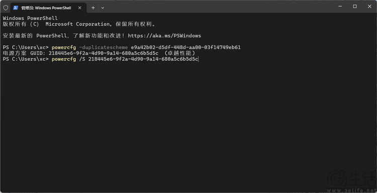 此时要先敲一个空格,再将前面的GUID选中、并粘贴到“powercfg /S ”(不包含引号)的后面,然后回车。