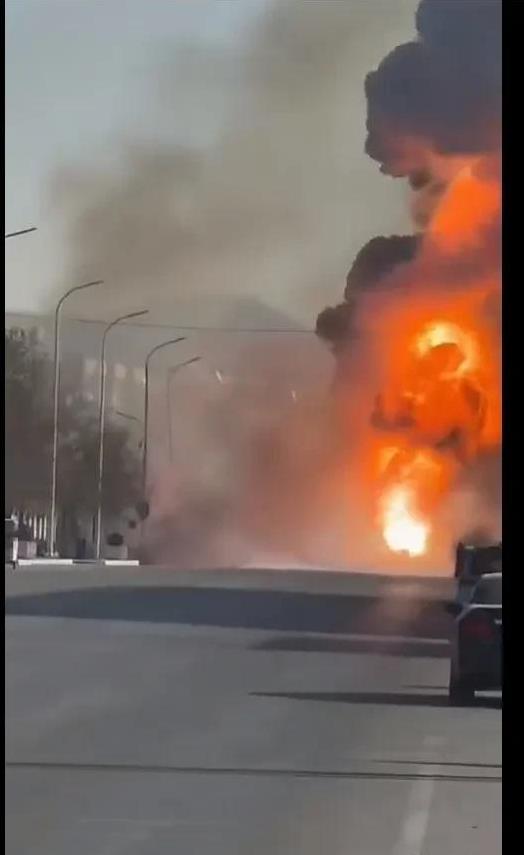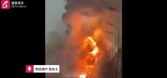 路口行人的视角,涛涛火势翻滚着冲天而起,像极了以前油罐车爆炸的场景,难怪有不明就里的网友会传说是油罐车爆炸,确实很像。