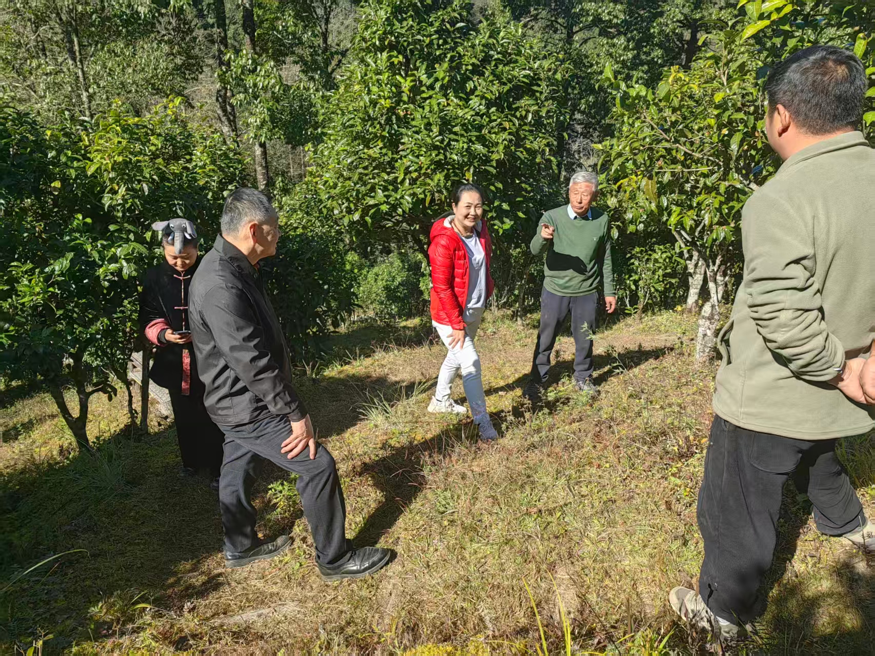 在马经理的细致引领下,谢红一行先后走访了封老爷茶的核心茶园与生产基地。站在刻有红色字迹的纪念石旁,马经理介绍道:“这片茶园的茶苗,正是源自1916年封镇国老爷带回的茶种,百年间从未间断培育,保留了最纯正的勐库大叶种特质。”步入高黎贡山核心茶园,海拔 1700-2000 米的山野间,60-100 年以上的野放茶树与森林植物共生,无连片规模化种植,靠自然平衡抵御病虫害,全程不施化肥农药。马经理介绍:“这些原生种籽繁殖的茶树,吸纳高黎贡山腐殖土养分与洁净山泉水,是‘采天地之灵气’的森林自然食品。” 众人触摸虬曲枝干,感受着印度洋温润气候滋养的独特茶韵。