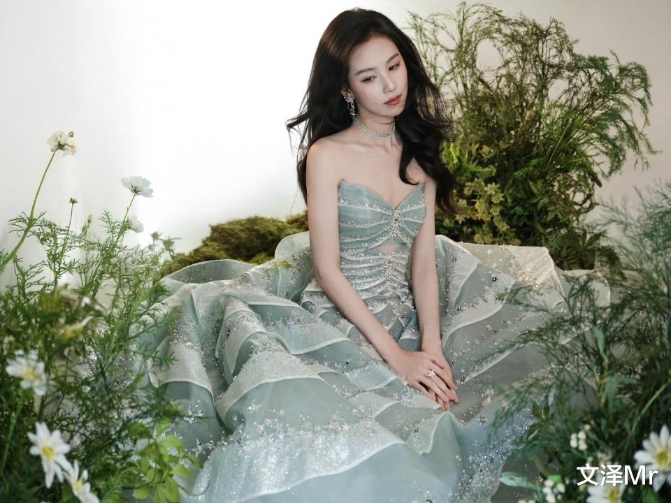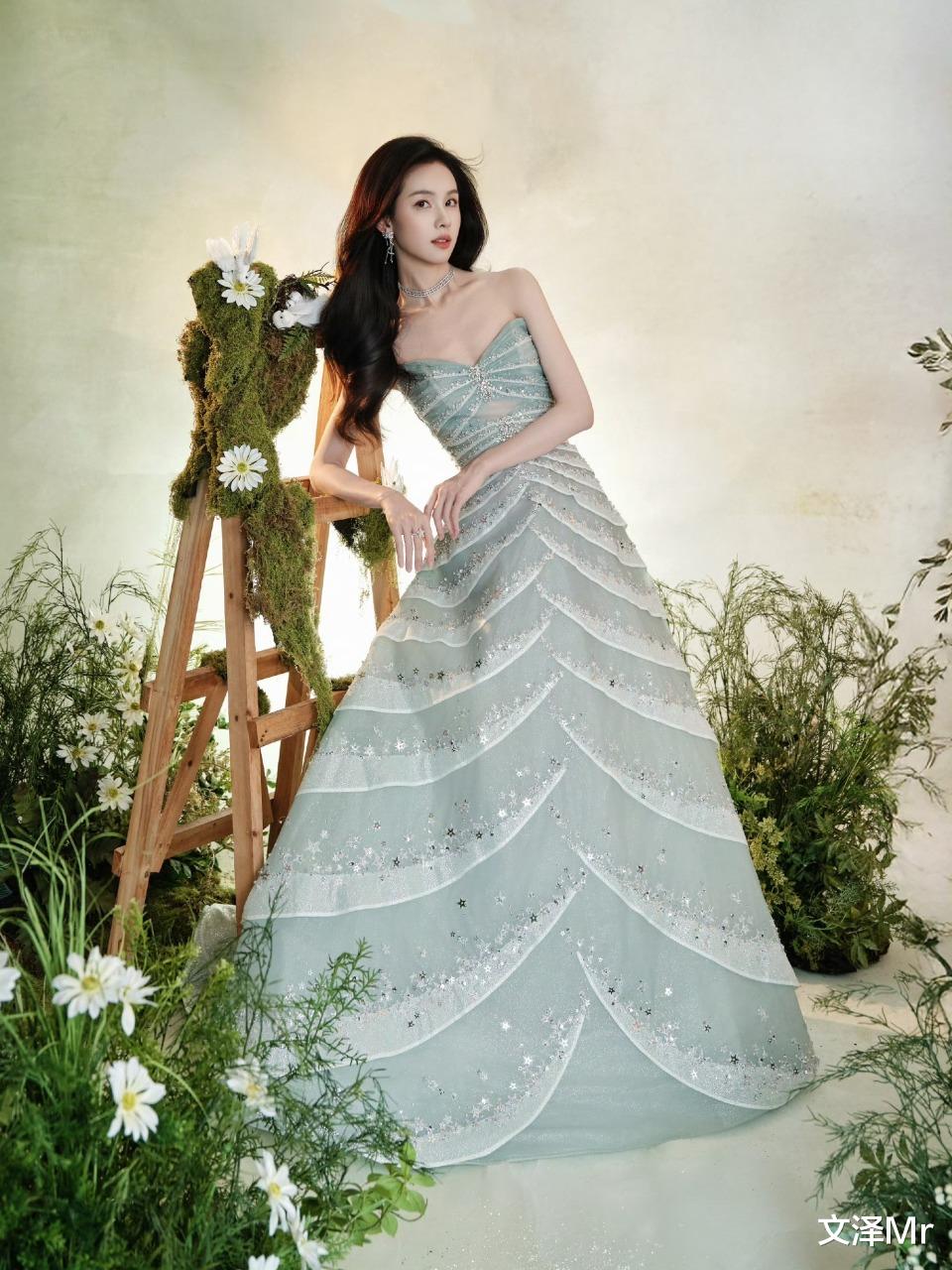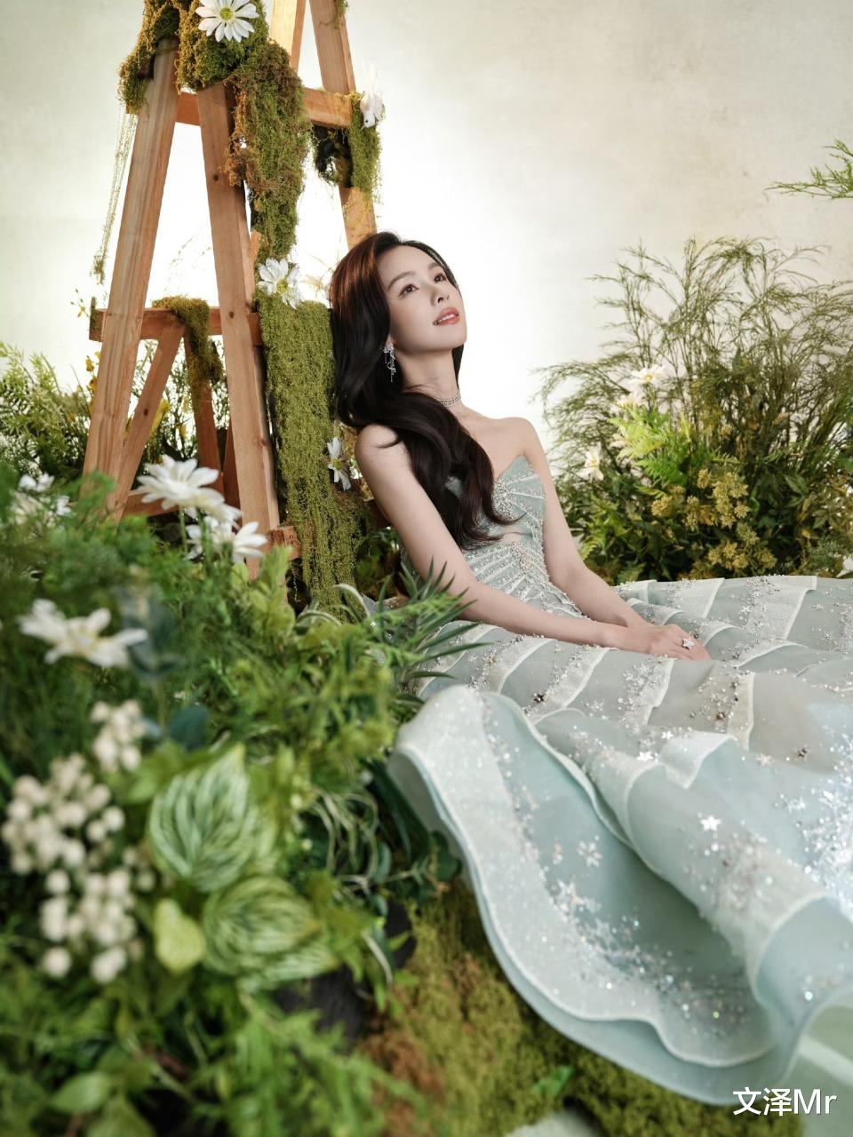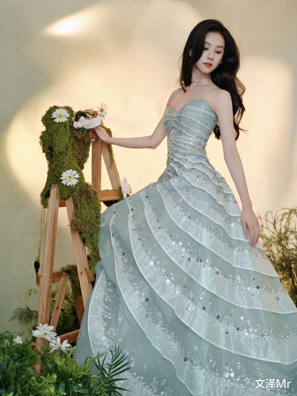 镜头转向侧靠木质梯架的陈都灵。浅绿长裙上的繁星钻饰在柔和光线下闪烁,她微微仰头凝视斜上方,低眉抬眼间尽显恬静。苔藓缠绕的梯架与裙摆的薄纱层次相映成趣,这一姿态让人想起她早年以素人照片获评高校校花冠军的经历——无需刻意摆拍,天生镜头感已足够动人。