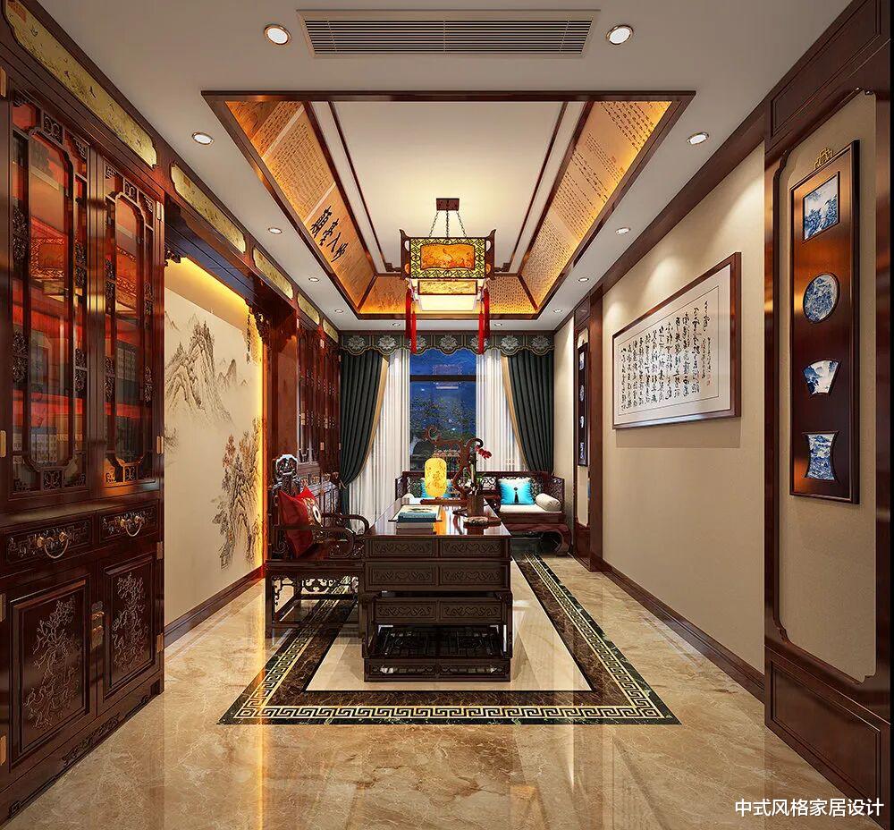 古典中式风格的别墅书房,整体深沉优雅,尽显宫廷气派。中央为深色红木书桌,搭配同材质座椅,桌上有笔墨纸砚;右侧是雕花木榻,榻上置青瓷花瓶与卷轴。书桌后方墙面绘水墨山水图,两侧对称设博古架,陈列古玩。顶部为木质格栅吊顶,嵌暖黄色灯带,搭配中式宫灯;地面铺米色大理石地砖,边缘饰回纹边框。以红木家具为核心,辅以青花瓷、水墨画等传统元素,线条繁复精美,色调沉稳大气,营造出金碧辉煌的古典意境。